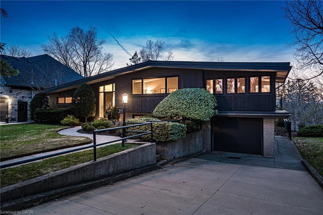 Welcome to this architectural gem, nestled in Guelph's coveted Old University neighbourhood. This mid-century modern home commands panoramic views of downtown Guelph, proudly perched atop Gordon Street hill.Upon entry, a striking corner fireplace pays homage to classic mid-century design, immediately setting the tone for the home's timeless character and warmth. Thoughtfully designed for both everyday living and effortless entertaining, the home features an open-concept kitchen with an eat-in dining area framed by floor-to-ceiling windows overlooking the private backyard. This space flows smoothly into a sunlit living and dining room, where expansive front-facing views create an inviting atmosphere-ideal for hosting and relaxing. Adjacent to the kitchen, a beautifully appointed TV room is surrounded by windows on three sides, immersing the space in natural light and offering direct access to the deck. This private outdoor retreat overlooks the meticulously manicured yard and faces west-delivering unobstructed views and sunsets, all year-round.The primary bedroom enjoys peaceful views over the front yard, while the second bedroom overlooks the lush backyard. Both rooms feature generous built-in storage and ample closet space accompanied by a well-appointed four-piece bathroom. The lower-level walkout features a third bedroom which provides flexibility for growing families or guests, complemented by a three-piece bathroom. Additionally, there is a versatile space offering both an office and guest sleeping quarters. This walkout level connects seamlessly to the backyard and includes a mudroom with access to the laundry area and garage, offering both functionality and convenience. The backyard is exceptional, showcasing mature evergreens and meticulously maintained garden beds within a fully fenced setting. Lovingly maintained and thoughtfully cared for, this is a once-in-a-lifetime opportunity to own a distinctive piece of Guelph's architectural heritage.