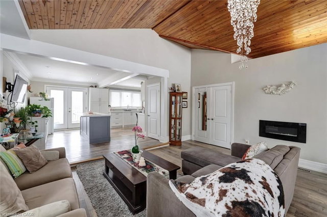 The fully renovated bungalow (2023–2025) features quality upgrades throughout including new windows, vinyl flooring and a durable metal roof. The spacious main floor offers a dramatic family room with 12' cathedral ceilings and electric fireplace, open concept sunroom, and a bright breakfast room with pantry, centre island&walk-out to deck. The modern kitchen features quartz countertops, glass backsplash and built-in appliances. The dining room showcases a striking stone feature wall, electric fireplace and walk-out to deck. Pot lights&crown moldings throughout.